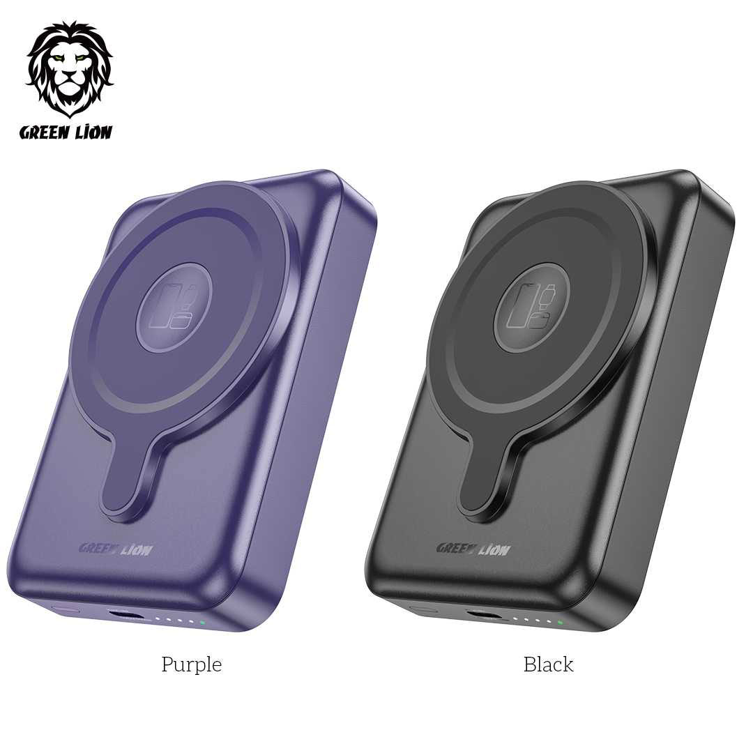 Introducing the Green Lion 10000mAh 3-in-1 MagSafe Power Bank, the ultimate in convenient charging that revolutionizes how you recharge. It is a multitasking power bank with super-fast PD 20W Fast Charging, customized outputs of 15W for your phone, 2.5W for the iWatch, and 5W for TWS Air Pods. With the help of MagSafe technology, it provides a stable magnetic connection so that charging may proceed without any issues. This power bank is designed to be your charging hub – streamlined, efficient, and cable-free. Slim and portable, with 2 colors, purple & black, this power bank easily fits into your bag or pocket, accompanying you on every journey. Low battery stress is a thing of the past thanks to this sleek, portable power bank that was created for life on the go.