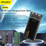 Awei P24K 5A 22.5W Fully compatible 3 Output + 1 Input , Charge up 3 devices at the same time PD 20W + QC Super Fast Charge LED Digital Screen Clear Power Status Support 22.5W + PD 20W Business Style with Comfortable Texture Polymer Battery , Multiple Protections Type-C input : DC5V/3A , 9V/2A , 12V/15A Type-C output : DC5V/3A , 9V/2.22A , 12V/1.67A ( Max ) USB output A/B : DC4.5V/5A , 5V/3A , 9V/2A , 12V/1.5A ( Max ) Size: 14.3 x 6.8 x 1.5cm
