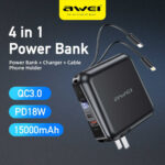 AWEI P48K Power Bank 15000mAh 4 in 1 Multifunction LED Display External Battery Built in 2 Cable Lightning Type C