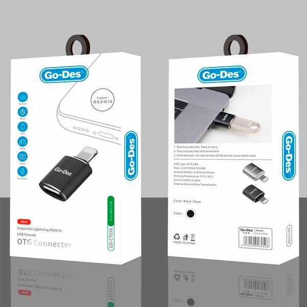 USB Connector For iPhone, Data Transfer with GD-CT056 you can easily and fast transfer your data from iPhone mobile to USB or USB to iPhone no need to install or download any software just plug and play to transfer data.
