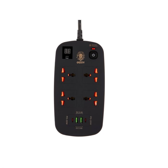 Green Lion 4 AC 2 USB & 2 USB-C PD 40W Multiport Smart Power Socket 3500W 3M with Timer & Overload Protection, Multi Power Plug Extension, Power Strip with USB & Type-C Charging Suitable for Home & Office, Safe and integrated core design, effectively improve the contact area between plug and socket, low-temperature rise, better electrical conductivity.