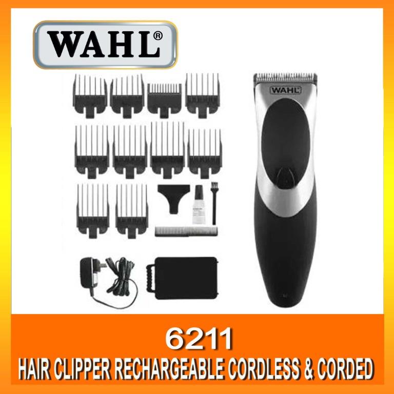 Cord/cordless hair clipper offers freedom of movement, use it with or without the cord; High-carbon steel blades are precision ground to stay sharp longer; Rechargeable, cordless, multi-position body groomer with “Grip It” rubber grip; Rinsable, detachable blades make cleaning simple; 19 piece kit packed in soft storage pouch featuring everything you need for a home haircut experience including comb attachments offering cutting lengths from 0.8 mm to 25 mm; Trims, shapes, defines and great for necklines; Exclusive Wahl guide combs and accessories; Features 60 minutes run time when fully charged. Ten Clipper Guide Combs: 3mm 6mm 10mm 13mm 16mm 19mm 22mm 25mm Left Ear Taper Right Ear Taper Package includes: Wahl 6211 Cordless Clipper; Storage case; Cleaning brush; Blade oil; Charger; Medium comb; Blade guard; Instructions manual. Optional Accessories: 120ml Stylno Professional Clipper Oil 4oz WAHL Professional Clipper Oil Clipper Setting Comb